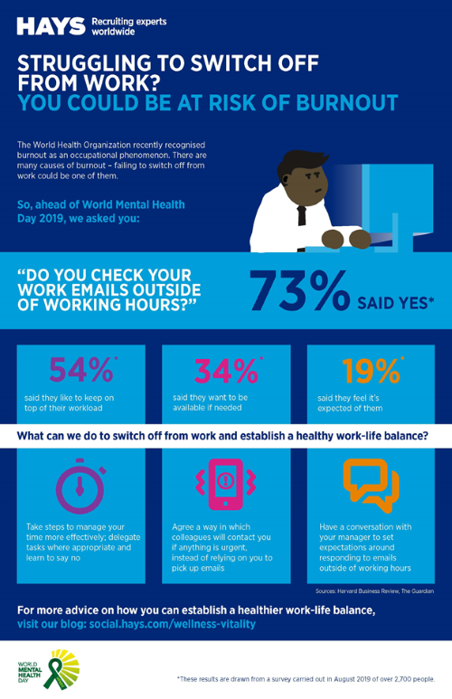 Hays, recently surveyed over 2,700 people across the globe to ask whether they check their emails outside of standard working hours and their reasons for doing so. Of the 73% who said they do check their emails, 54% said it is to keep on top of their work, while 34% said they want to make themselves available in case they are needed. And worryingly, a further 19% stated they find it difficult to switch off from work and 19% said they feel it is expected of them.