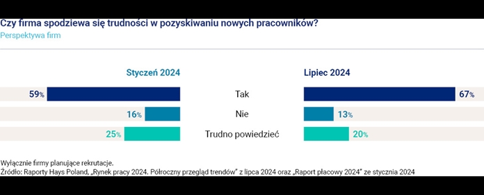 Plany rekrutacyjne deklaruje 84 proc. firm objętych badaniem Hays, natomiast wiele z nich będzie dotyczyło wypełnienia wakatów powstałych wskutek rotacji pracowników. Spowolnienie na rynku pracy nie sprawiło jednak, że rekrutacje stały się szybkie i łatwe. Na przestrzeni półrocza aż o 8 pkt proc. wzrósł odsetek pracodawców spodziewających się wyzwań rekrutacyjnych.