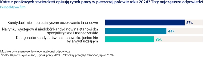 Ponadto 57 proc. ogółu pracodawców zgadza się z twierdzeniem, że w pierwszym półroczu 2024 kandydaci mieli nierealistyczne oczekiwania finansowe, natomiast 44 proc. – że na rynku występował niedobór kandydatów na stanowiska specjalistyczne i menedżerskie.
