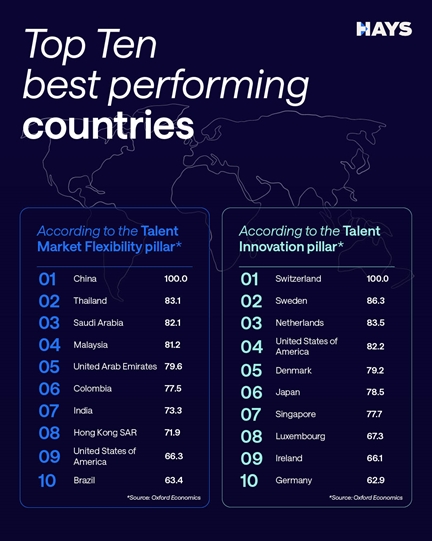 The Hays Global Talent Tracker, developed with Oxford Economics, offers a comprehensive view of labour market dynamics across 35 countries, assessing hundreds of indicators from workforce participation and skills development to legislative flexibility and tech talent availability. The analysis shows that flexibility without innovation creates companies that are quick to respond to market changes, but struggle to create truly cutting-edge products and services, whereas innovation without flexibility slows progress, making the combination essential for future-ready economies.