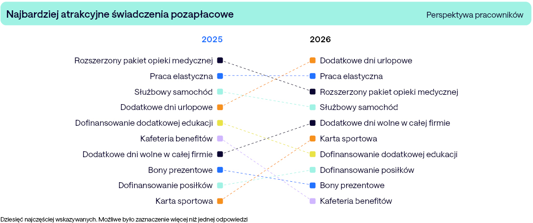 A tych do wyboru jest wiele. Z tegorocznej edycji raportu wynika, że te, na których zależy pracownikom najbardziej to: dodatkowe dni urlopowe, które na przestrzeni roku przesunęły się o 3 miejsca w górę, praca elastyczna i rozszerzony pakiet opieki medycznej.