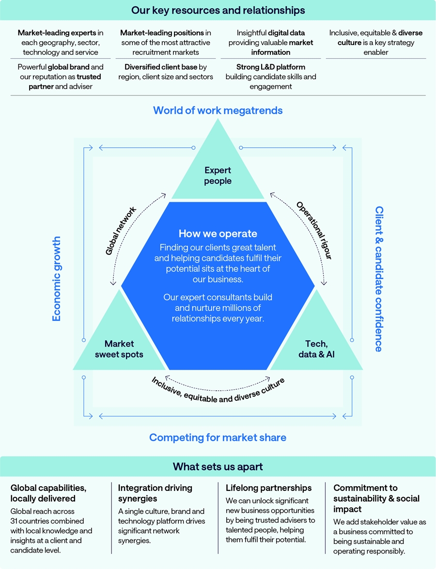 Millions of relationships are formed and nurtured by our consultants and, by becoming trusted advisers to talented people, helping to navigate their careers and fulfil their potential, we unlock significant opportunities. Clients can count on our high quality of service and market insights to provide unrivalled access to top talent and help them scale and flex their evolving workforces. We add additional stakeholder value through our commitment to being sustainable and operating responsibly.