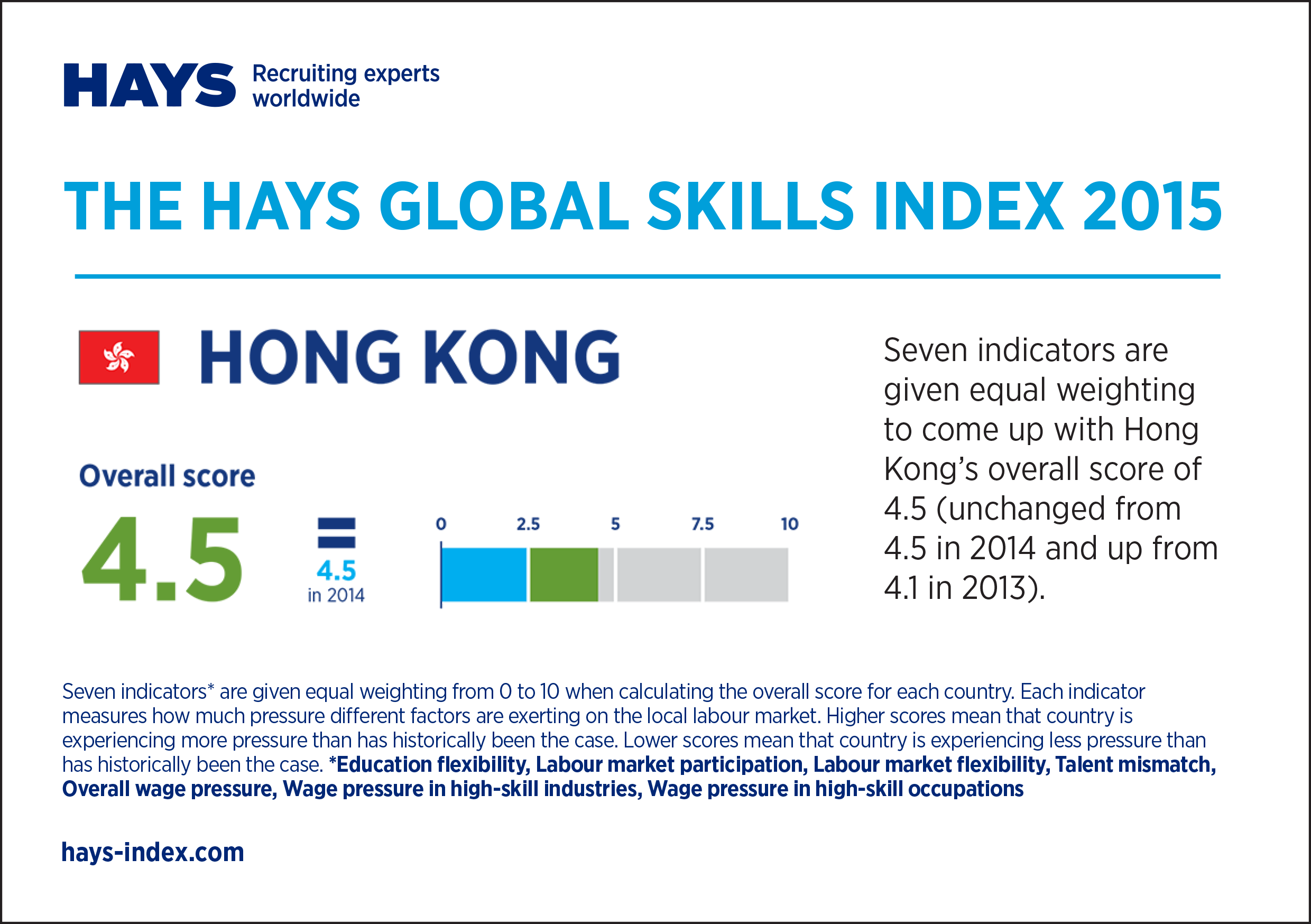 The Hays Global Skills Index, produced in collaboration with Oxford Economics and released today, scores Hong Kong’s labour market against seven indicators, or points of potential pressure. For each indicator Hong Kong received a score out of 10. A score close to 0 indicates little to no pressure, while a score close to 10 shows severe pressure.